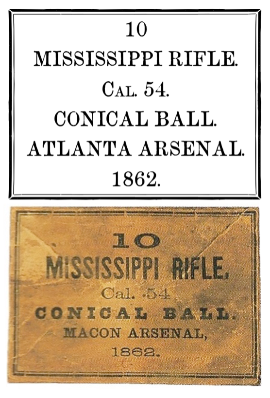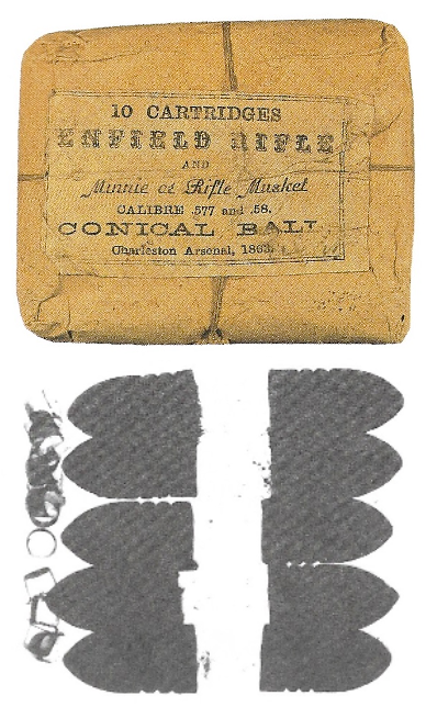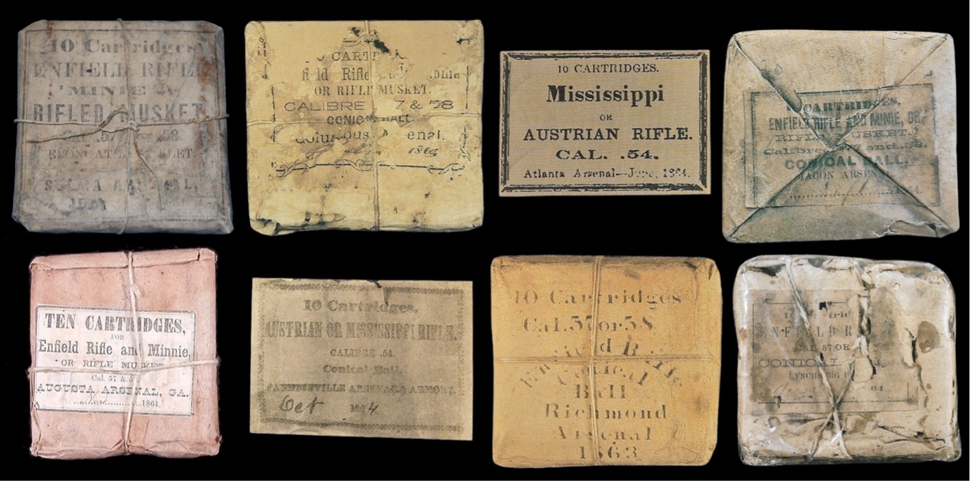 At least some of the Confederate arsenals appear to have initially followed this wartime expedient, simply wrapping their ammunition in unlabeled paper bundles. Recounting an inspection of Charleston Arsenal, however, Confederate Superintendent of Laboratories John W. Mallet noted on 18 June 1862; “The bundles of (10) small arms cartridges, here as at Richmond, are not marked in any way. I have suggested to Capt. [Frederick] Childs [Superintendent of Charleston Arsenal], and he has promised to act upon the suggestion, that in future each bundle shall be marked with at least the caliber of the arm for which it is intended. Would it not be well, in view of the great risk, which our medley assortment of arms in the same regiment and even company entails, to introduce this same rule at Richmond?… The marking might be done very quickly by a stamp or stencil.”2